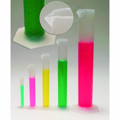 Our polypropylene one-piece measuring cylinders have raised graduations for easy readability. They are autoclavable and have excellent contact clarity. The hexagonal base provides excellent stability to the cylinder, and the tapered spout enables easy pouring of reagents. Stated tolerances are the same as graduated intervals below.