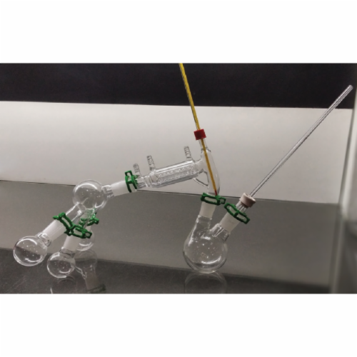 This kit contains essential components for short path distillation. All glass partsare manufactured from high quality 3.3 borosilicate glass.Short Path Distillation Head with 24/40 flask joints and 10/30 thermometer portfeatures a condenser coil and three ¼” hose nozzles, two for condenser andone for vacuum.The cow-type Distillation Receiver has one 24/40 outer joint and three 24/40inner joints that can be used to attach up to three (included) 50ml Single Neckround bottom flasks.The 250ml round bottom 2-Neck flask includes 24/40 outer joints to accept theDistillation Head and the Rubber Inlet Adapter. The Rubber Inlet Adapter holdsthe tapered Glass Inlet Tube.The Thermometer, with a range of -10° to 50° C and filled with a petroleumbasedsolution with red dye, connects to the Distillation Head through the10/30 port.Plastic Clamps (six included in the kit), size 24, are used to secure glasswareconnections.Penny Head Glass Stoppers (three included in the kit) are used to cap the50ml Single Neck round bottom flasks after distillate is collected.Contents:1. Short Path Distillation Head, Vacuum Jacketed, 24/40 . . . . . . . . . . . . . 12. Flask, Round Bottom, 2-Neck 250ml . . . . . . . . . . . . . . . . . . . . . . . . . . . 13. Distillation Receiver, Cow-Type, 1-to-3, 24/40 . . . . . . . . . . . . . . . . . . . . 14. Glass Inlet Tube, with Tapered End, 11” . . . . . . . . . . . . . . . . . . . . . . . . . 15. Clamp for Jointed Glassware, Plastic, size 24 . . . . . . . . . . . . . . . . . . . . 66. Thermometer, Red Spirit, -10° to 50° C, 12” . . . . . . . . . . . . . . . . . . . . . . 17. Flask, Round Bottom, Single Neck, 50ml, 24/40 . . . . . . . . . . . . . . . . . . 38. Inlet Adapter, Rubber, with Glass Connector, 24/40 . . . . . . . . . . . . . . . . 19. Stopper, Glass, Penny Head, 24/40 . . . . . . . . . . . . . . . . . . . . . . . . . . . . 3