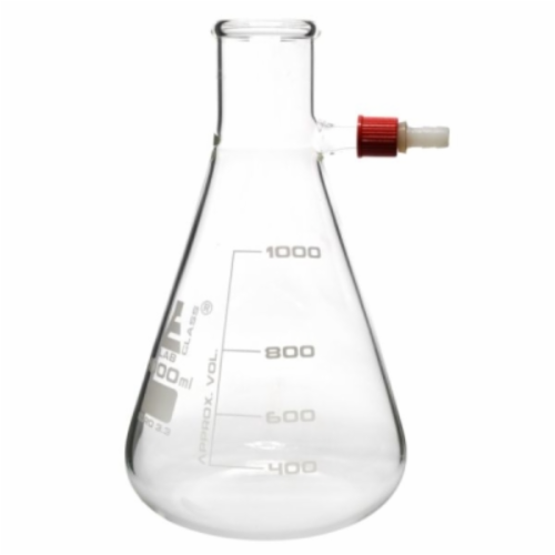 Filtering conical flask made of high quality Borosilicate glass with an integral plastic side arm. 1000ml capacity with white graduations. Conical shape for spill prevention. Stands 9" tall, with a sidearm length of 2.25".