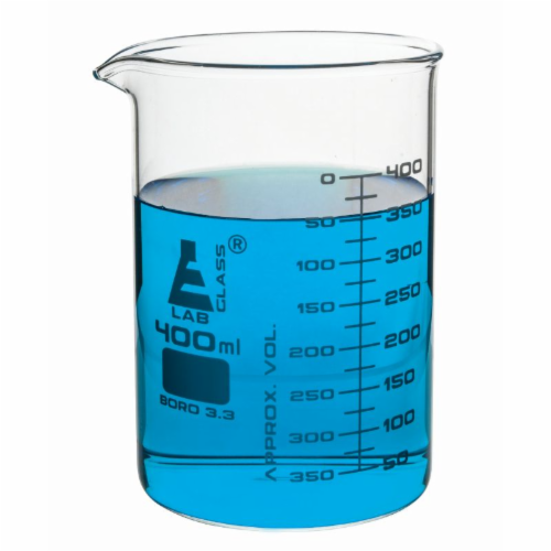 Low form 400ml beaker with spout, made of borosilicate glass, graduated as per ASTM-E960.